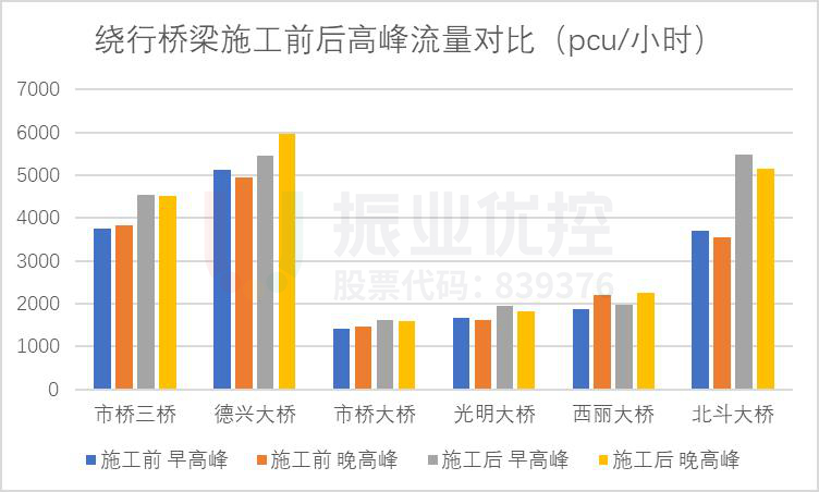 從數(shù)據(jù)觀察得知6座橋梁高峰通勤車流量均有所上升,其中市橋三橋早、晚高峰,德興大橋晚高峰及北斗大橋早、晚高峰,流量漲幅明顯,特別是北斗大橋,成為沙灣大橋封閉后連結(jié)南沙及番禺的主要通道,車流增幅明顯,達到45%,工程師根據(jù)流量變化情況對預(yù)設(shè)方案進行實時調(diào)整。