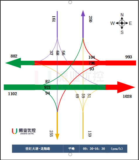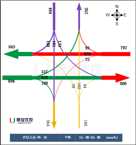 世紀(jì)大道平峰時(shí)段東西方向車流主體以直行為主,右轉(zhuǎn)車輛占比較少,導(dǎo)致右轉(zhuǎn)車道利用度低,路口通行效率不高。