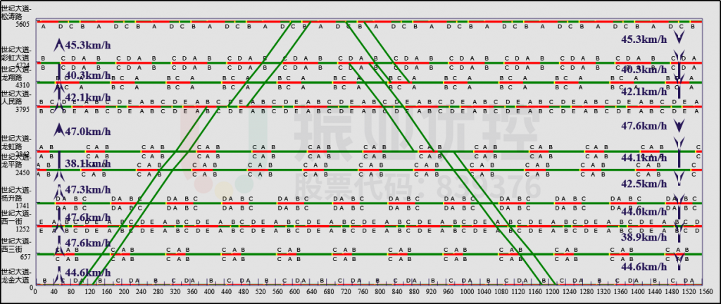 由于該路段車流量大,車型種類豐富導(dǎo)致整體通行速度較低,通行效率不高。故對(duì)世紀(jì)大道設(shè)計(jì)平峰時(shí)段綠路協(xié)調(diào)控制方案,提高通行效率,提升行車體驗(yàn)感。