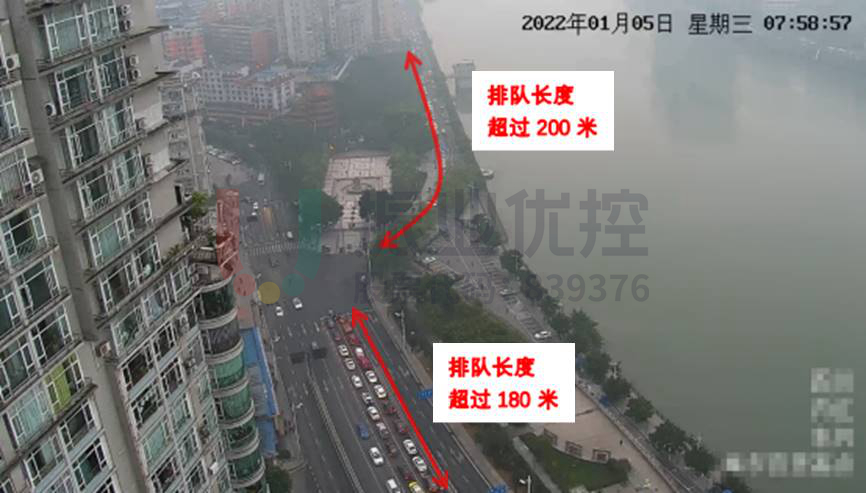 路口擁堵集中在早高峰(7:30-9:00)及晚高峰(17:30-19:00)西進口進隧道方向以及南進口方向,南進口僅一條直左車道,排隊較長。此外,南出口(臨江路)路側有停車泊位占道,影響車輛通行。