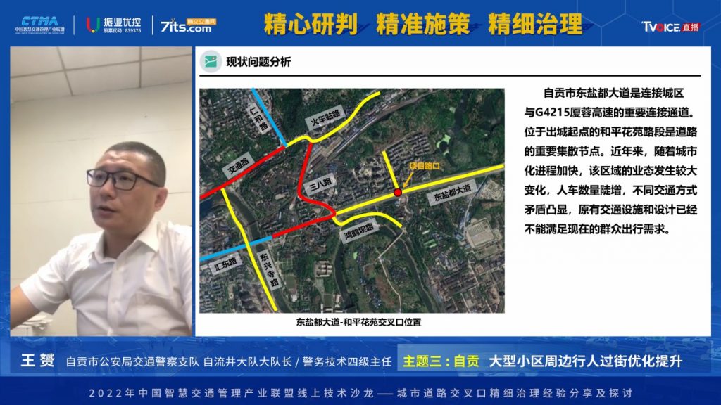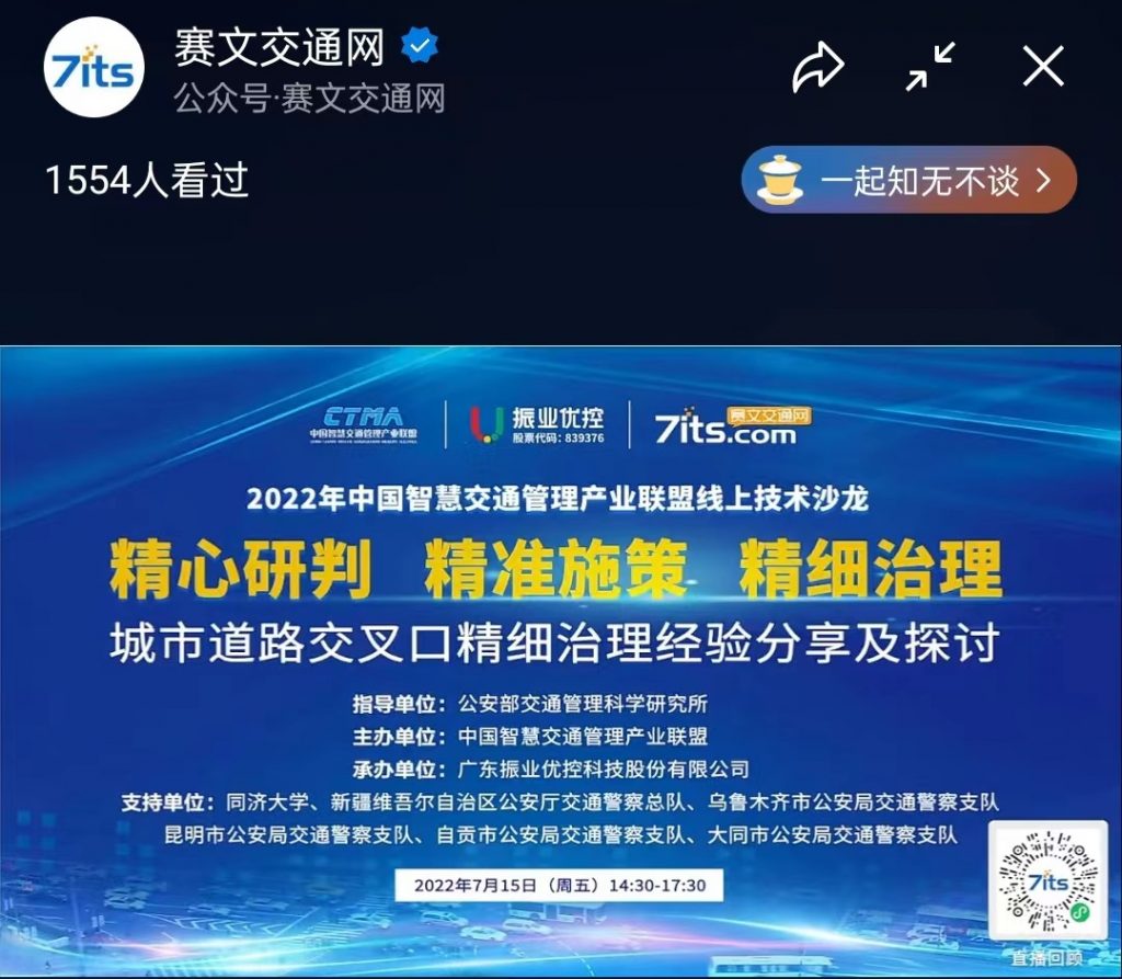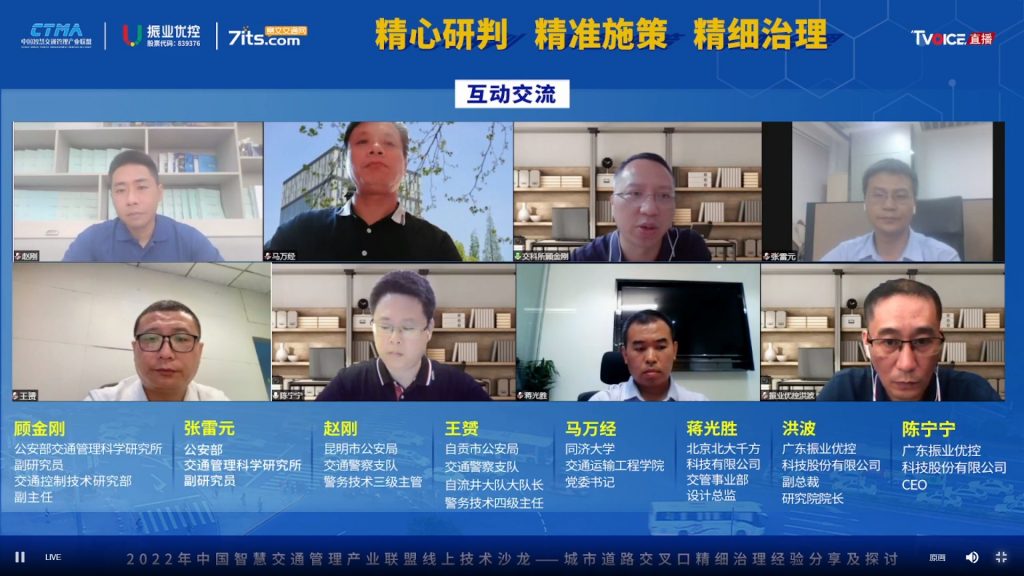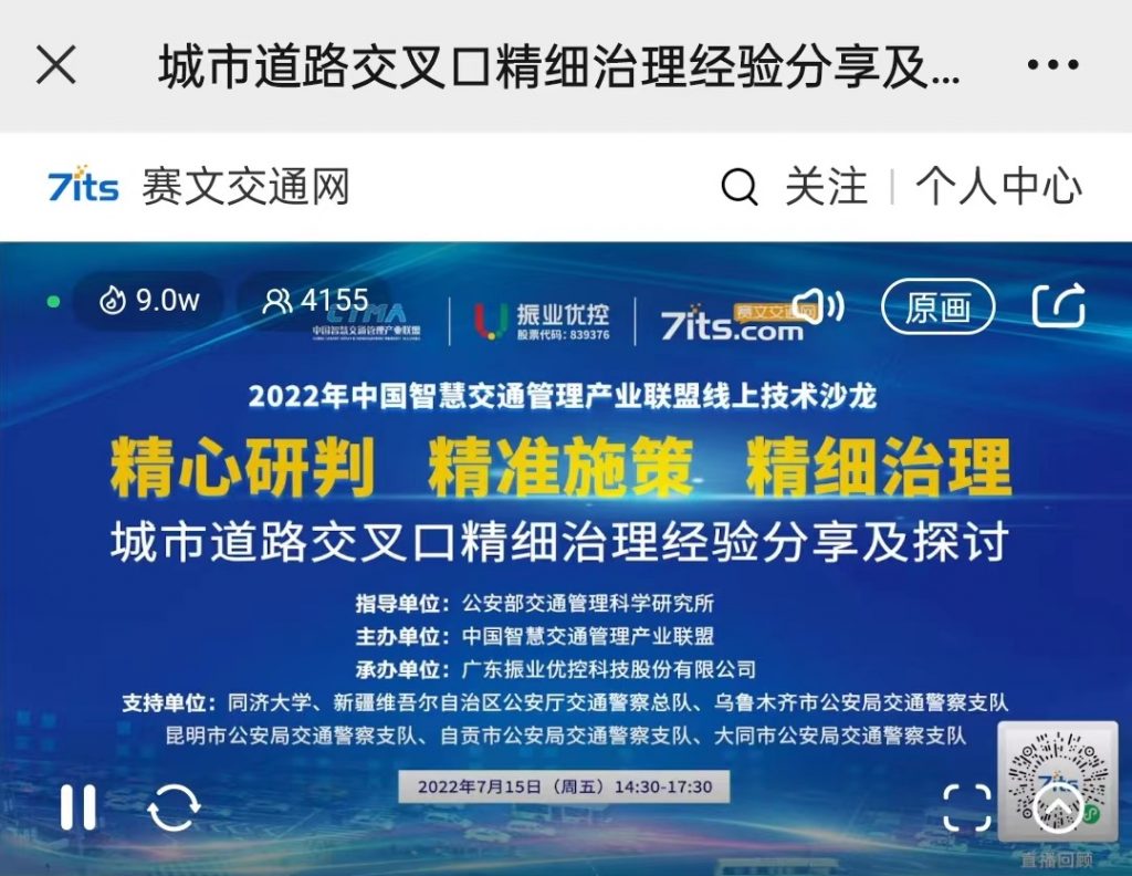 2022年7月15日,由公安部交通管理科學研究所(以下簡稱“交科所”)指導,中國智慧交通管理產(chǎn)業(yè)聯(lián)盟(以下簡稱“產(chǎn)業(yè)聯(lián)盟”)主辦,產(chǎn)業(yè)聯(lián)盟交通規(guī)劃與設計組組長單位廣東振業(yè)優(yōu)控科技股份有限公司(以下簡稱“振業(yè)優(yōu)控”)承辦,主題為“精心研判 精準施策 精細治理”的城市道路交叉口精細治理經(jīng)驗分享及探討線上技術沙龍在賽文直播平臺成功舉辦。