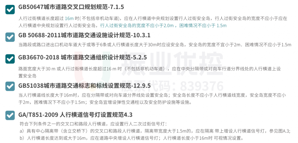 按照城市道路交叉口規(guī)劃規(guī)范、城市道路交通設(shè)施設(shè)計(jì)規(guī)范、城市道路交通組織設(shè)計(jì)規(guī)范等國家標(biāo)準(zhǔn)規(guī)范和行業(yè)規(guī)范,行人過街安全長(zhǎng)度超過16米后,應(yīng)該設(shè)置行人過街安全島。