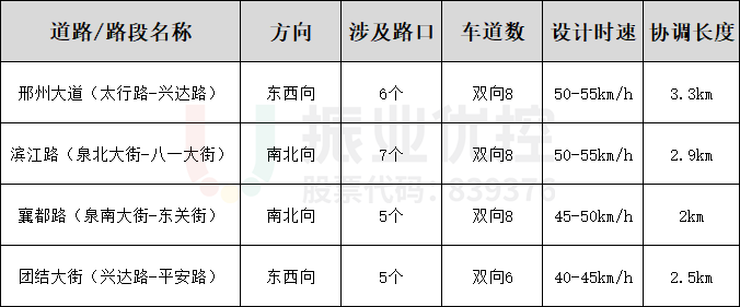 濱江路(泉北大街-八一大街)以南北為基準(zhǔn),設(shè)計(jì)南北雙向協(xié)調(diào)方案,設(shè)計(jì)速度為55km/h,雙向均可一次性通過。