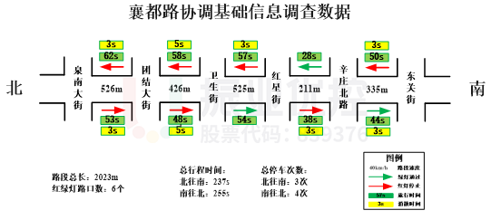 襄都路(泉南大街-東關(guān)街)以南北為基準(zhǔn),設(shè)計(jì)南北雙向協(xié)調(diào)方案,設(shè)計(jì)速度為45km/h,雙向均可一次性通過。