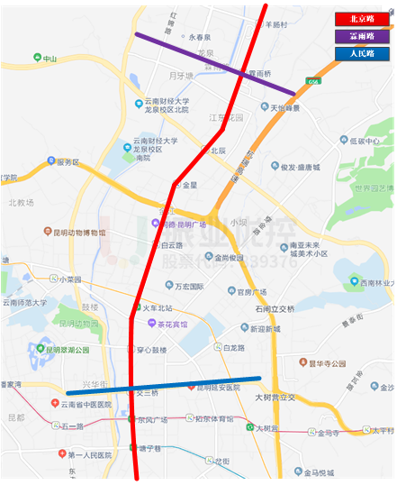北京路是昆明市南北向重點(diǎn)主干道之一,路段道路條件較好,為雙向六車(chē)道;作為昆明市發(fā)展的主軸,承擔(dān)著許多重要的綜合服務(wù)功能,在昆明市城市化進(jìn)程中發(fā)揮著重要作用。