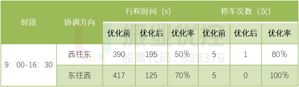 經(jīng)優(yōu)化升級(jí)后,世紀(jì)大道(協(xié)調(diào)路段)東西雙向的車輛停車次數(shù)、行程時(shí)間顯著降低,具體數(shù)據(jù)見(jiàn)下表: