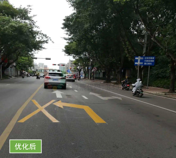 優(yōu)化效果:南進口直行與右轉(zhuǎn)車輛通行順暢,通行效率也得到提高;南出口道標志標線清晰。