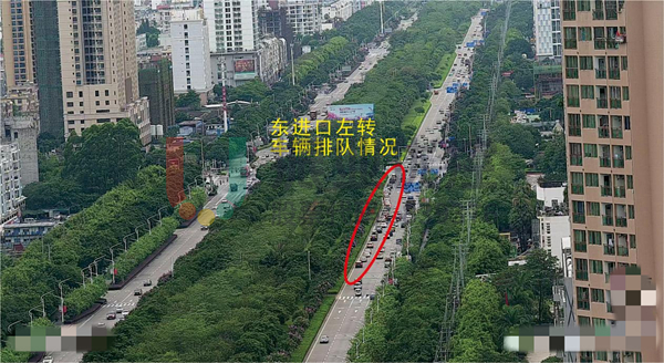 優(yōu)化效果:東進口左轉(zhuǎn)車輛長排隊情況得到緩解,同時左轉(zhuǎn)車輛不再阻擋直行車輛,有效提高了路口的通行效率。