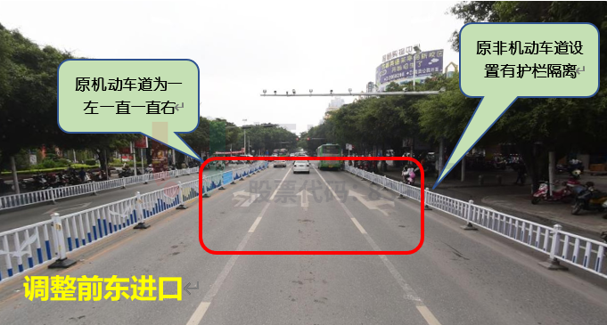 優(yōu)化效果:高峰時段非機動車進入前置待行區(qū),滿足非機動車的排隊需求,非機動車不再阻擋右轉(zhuǎn)機動車通行;放行南北直行相位時南北左轉(zhuǎn)機動車輛進入左轉(zhuǎn)待行區(qū),有效提高通行效率,緩解左轉(zhuǎn)車輛的排隊壓力。