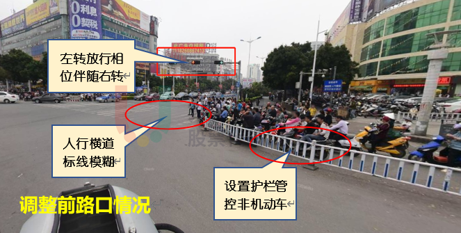 問題簡述:高峰時段,各方向非機動車流量較大但非機動車道較窄,導致排隊長,阻擋后方右轉(zhuǎn)機動車通行,并出現(xiàn)機非混行,存在安全隱患;路口采用南北左轉(zhuǎn)對稱放行,因流量不對稱,出現(xiàn)北左轉(zhuǎn)排隊、南左轉(zhuǎn)空放現(xiàn)象。