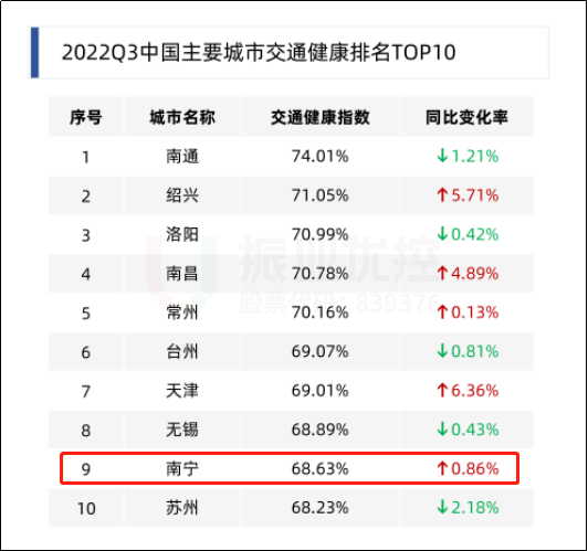 根據(jù)互聯(lián)網(wǎng)平臺(tái)數(shù)據(jù),南寧市入選2022年第三季度中國主要城市交通健康排名TOP10,健康指數(shù)同比上升0.86%。