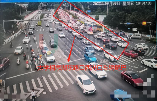 問題簡(jiǎn)述:清川立交橋西口下橋匝道與大學(xué)東路-相思湖東路口的距離僅345米左右,高峰時(shí)段車輛容易排隊(duì)至匝道甚至立交橋上,影響快速路車輛行駛;兩路口之間的距離為790米左右,高峰時(shí)段東西雙向車流量大,東西雙向車輛均會(huì)反堵至路口。