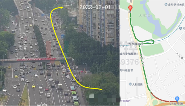 7月,人和大道晚高峰截面通過流量達(dá)5469pcu/h,同比4月的5205pcu/h,上升5.07%;最右側(cè)車道通行量平均增加了544pcu/h,增幅達(dá)44.8%,高峰消散時(shí)間提前10分鐘左右;高峰內(nèi)環(huán)下道口紅綠燈綠信比由0.31提高至0.51,提升64.5%,內(nèi)環(huán)下道無明顯排隊(duì)現(xiàn)象,行程時(shí)間減少15分鐘左右。