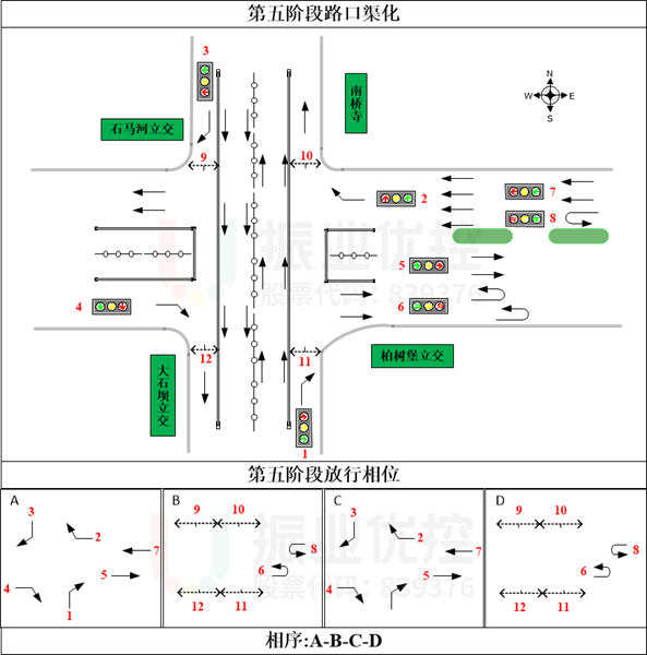 2022年4月,根據(jù)工程施工進(jìn)度(下穿道與平交路口中央?yún)^(qū)域施工),路口交通組織再次發(fā)生變化,隨即根據(jù)道路通行條件和交通流量流向的變化調(diào)整配時(shí)方案與放行方式。