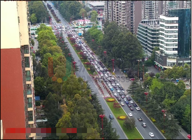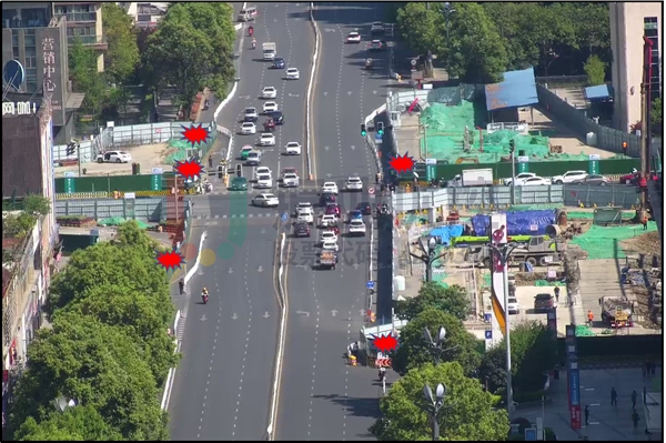 3.交叉口東、西、南、北向均存在占道施工情況,大大降低交叉口通行效率。其中,西進(jìn)口直行擁堵尤為嚴(yán)重,車輛排隊長度達(dá)700米,并回溢至下游文忠街-玉屏街交叉口。