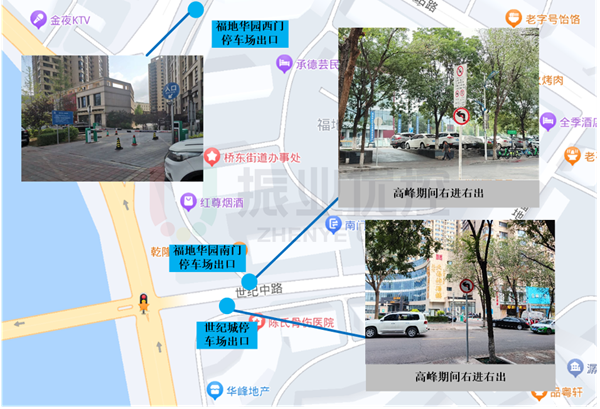 東口福地華園、世紀城的停車場出入口設(shè)置高峰限時禁左標志牌,進出車輛只能右進右出,減少對路段車流的影響。