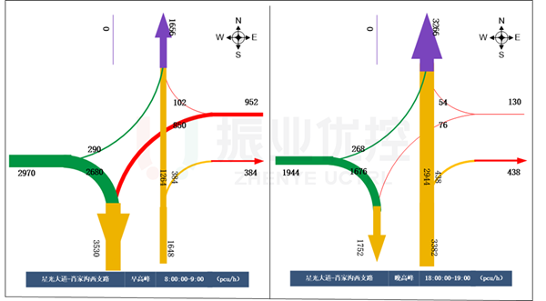 早高峰出口道流量為3530pcu/h,進(jìn)口道流量為1656pcu/h;晚高峰出口道流量為1752pcu/h,進(jìn)口道流量為3266pcu/h。