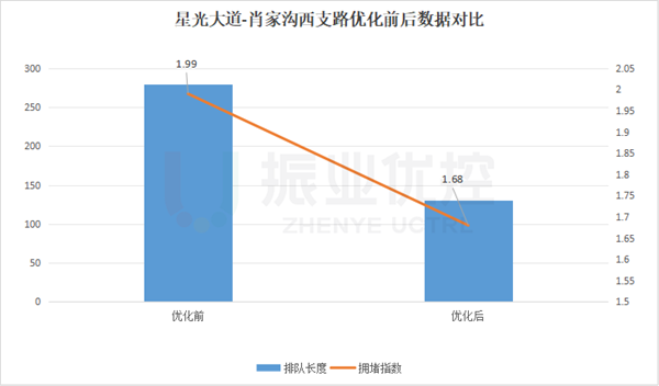 晚高峰南進(jìn)口車流排隊(duì)長度從280米縮短至130米,下降了53.5%,通行效率提升了20%;路口擁堵指數(shù)由1.99下降至1.68,下降了15.58%。