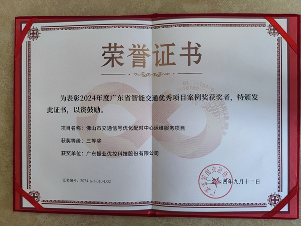 此外,主辦方還舉辦了頒獎(jiǎng)盛典,我司“佛山市交通信號(hào)優(yōu)化配時(shí)中心運(yùn)維服務(wù)項(xiàng)目”榮獲2024年度廣東省智能交通協(xié)會(huì)優(yōu)秀項(xiàng)目案例獎(jiǎng)三等獎(jiǎng)。該項(xiàng)目通過組建佛山市交通信號(hào)配時(shí)中心,建立城市交通信號(hào)管理機(jī)制,提供城市交通緩堵輔助決策服務(wù),落實(shí)城市交通信息智能決策支持體系,對(duì)佛山市交通信號(hào)控制進(jìn)行優(yōu)化。