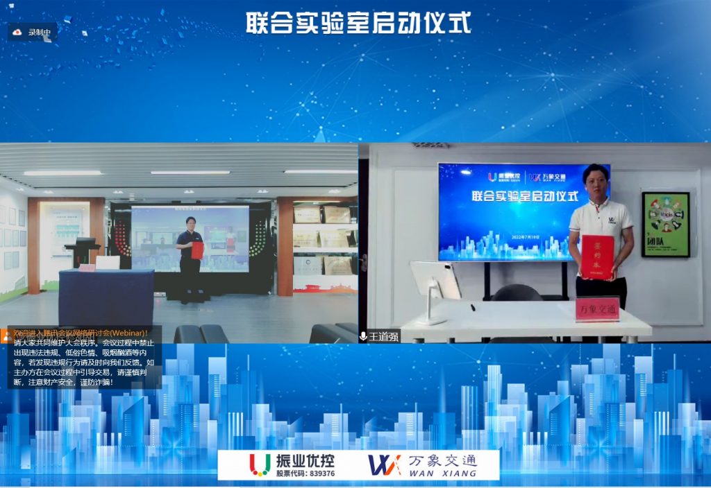 2022年7月19日,廣東振業(yè)優(yōu)控科技股份有限公司(簡(jiǎn)稱“振業(yè)優(yōu)控”)與黑龍江萬象交通科技有限公司(簡(jiǎn)稱“萬象交通”)舉行“振業(yè)優(yōu)控-萬象交通聯(lián)合實(shí)驗(yàn)室”簽約儀式。振業(yè)優(yōu)控CEO陳寧寧博士、萬象交通技術(shù)總監(jiān)王道強(qiáng)參加此次儀式。
