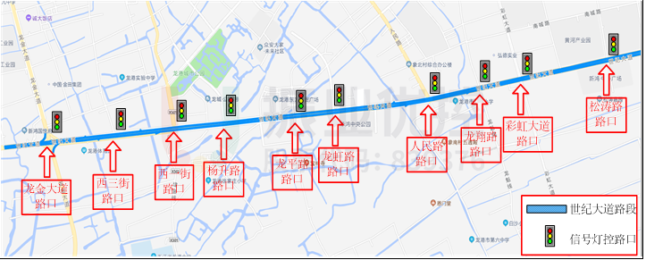 世紀(jì)大道為龍港市東西走向城市主干道之一,西接龍金大道,東接新城區(qū)域,承載市區(qū)進(jìn)出城方向的主要交通流。路段全長5.6公里,沿途分布10個(gè)紅綠燈路口。該路段沿線分布眾多住宅區(qū)、學(xué)校、工業(yè)園區(qū)等,市民日常出行需求及貨運(yùn)需求大,道路通行壓力較大。