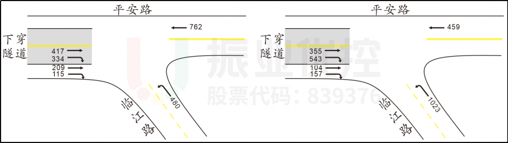 路口西側進出口為下穿隧道與輔路,早晚高峰時段承載交通壓力較大;南側(臨江路)進口為單車道,早晚高峰時段匯流車流排隊擁堵現(xiàn)象明顯;(平安路)東進口方向通行較為順暢。