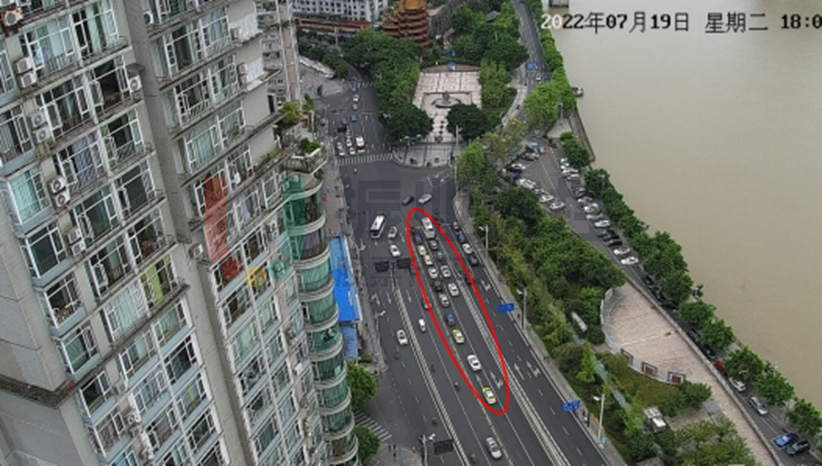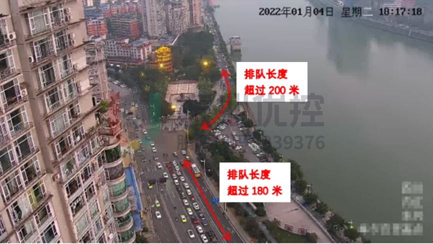 路口擁堵集中在早高峰(7:30-9:00)及晚高峰(17:30-19:00)西進口進隧道方向以及南進口方向,南進口僅一條直左車道,排隊較長。此外,南出口(臨江路)路側有停車泊位占道,影響車輛通行。