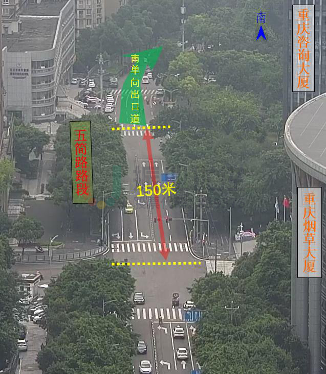 五簡路為重慶江北主城區(qū)重要交通道路,道路為南北走向,承載著五里店立交及江州立交兩座大型立交橋往來渝中區(qū)、南岸區(qū)、渝北區(qū)的交通流,且附近寫字樓、住宅區(qū)較為密集,日常人車流量巨大。
