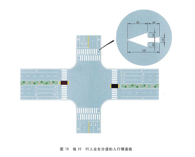 缺點(diǎn):雙側(cè)行人流量都比較大時(shí)容易出現(xiàn)對(duì)向人流交織的情況,可以通過設(shè)置左右分道的行人過街來進(jìn)一步解決。