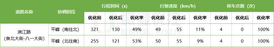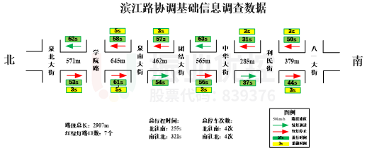 濱江路(泉北大街-八一大街)以南北為基準(zhǔn),設(shè)計(jì)南北雙向協(xié)調(diào)方案,設(shè)計(jì)速度為55km/h,雙向均可一次性通過。