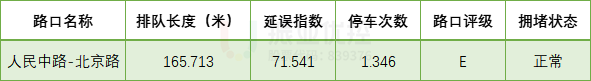北京路-人民路是主城區(qū)“三橫四縱”主干道的交會(huì)節(jié)點(diǎn)之一,周?chē)植贾≌瑓^(qū)、學(xué)校、公園、酒店、綜合商業(yè)區(qū)等流量吸引場(chǎng)所,疊加高峰時(shí)段上下班通勤車(chē)流造成的潮汐現(xiàn)象(早高峰進(jìn)城車(chē)輛較多,晚高峰相反),使得該路口全天各時(shí)段都承載著較大的交通壓力,早晚高峰時(shí)段平均排隊(duì)長(zhǎng)度達(dá)165米,延誤指數(shù)高達(dá)71。