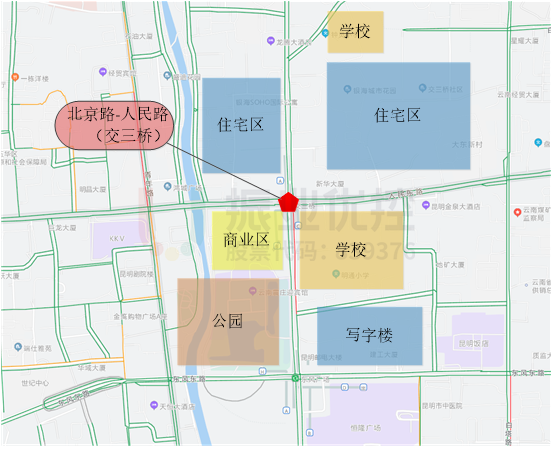 北京路是昆明市南北向重點(diǎn)主干道之一,路段道路條件較好,為雙向六車(chē)道;作為昆明市發(fā)展的主軸,承擔(dān)著許多重要的綜合服務(wù)功能,在昆明市城市化進(jìn)程中發(fā)揮著重要作用。