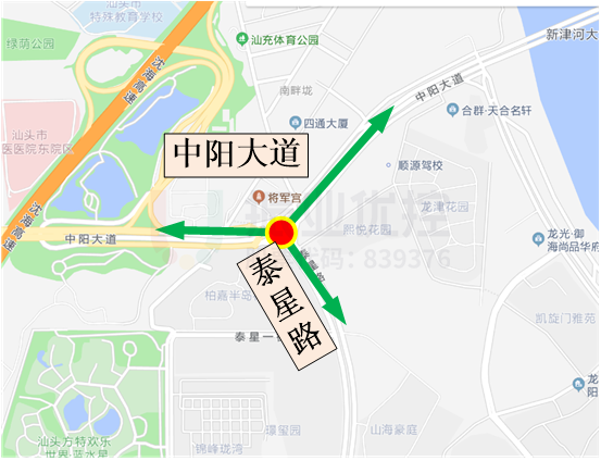 中陽泰星路口是汕頭城區(qū)前往東海岸片區(qū)、澄海區(qū)、南澳島等片區(qū)的重要節(jié)點路口。中陽大道主線西聯(lián)中泰立交橋引道,主線兩側(cè)輔道與泰星路T字型平交,形成一條U型通道。