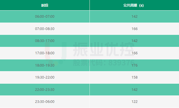 以西門路口為重要節(jié)點路口,根據(jù)西門路口方案周期及路段流量情況,確定此路段綠波協(xié)調(diào)的公共周期及時段表,如下表所示: