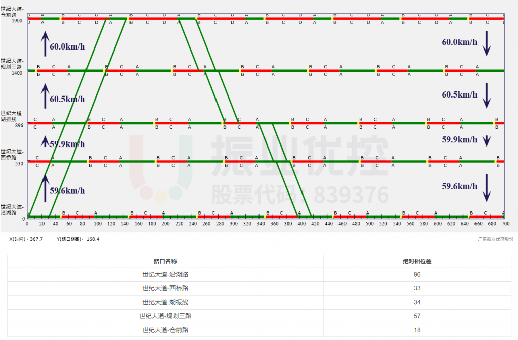 世紀(jì)大道(協(xié)調(diào)路段)設(shè)計(jì)東西雙向協(xié)調(diào)方案,設(shè)計(jì)速度為60km/h,東往西不停車通過(guò),西往東停車1次。
