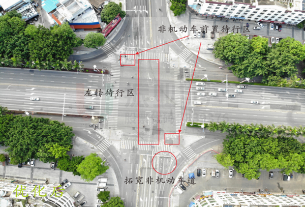 通過增加左轉(zhuǎn)待轉(zhuǎn)區(qū)與非機動車前置待行區(qū),改善路口整體通行情況,同時消除高峰期間擁堵情況。