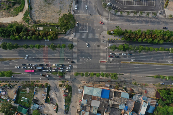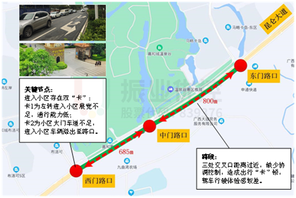 對(duì)路口交通問題進(jìn)行精準(zhǔn)研判,針對(duì)小區(qū)進(jìn)出口通行能力短板問題開展重點(diǎn)改造,解決路口通行能力失衡引發(fā)的擁堵問題,結(jié)合協(xié)調(diào)控制方案,由點(diǎn)到線提升主干道車流的通行效率。