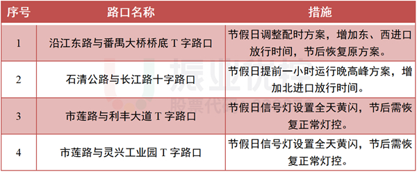 根據(jù)往年轄區(qū)交通出行規(guī)律,春節(jié)假期前后一周會呈現(xiàn)明顯的節(jié)前出城返鄉(xiāng)、節(jié)后進城返城交通流特征。針對此交通流特征,對進出城區(qū)主干道沿江東路與番禺大橋橋底路口、石清公路與長江路路口、市蓮路與利豐大道路口、市蓮路與靈興工業(yè)園路口等4個重要節(jié)點路口設(shè)置節(jié)假日前后交通預(yù)案。