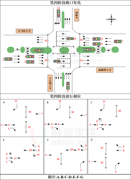 優(yōu)化措施:利用已經(jīng)改造后的路口空間結(jié)構(gòu),結(jié)合目前的施工組織調(diào)整,精細(xì)化信號(hào)配置,提升路口通行效率?!玖飨蛘{(diào)整:途徑路口各方向的車流均需通過(guò)右轉(zhuǎn)前往遠(yuǎn)端掉頭完成繞行。】