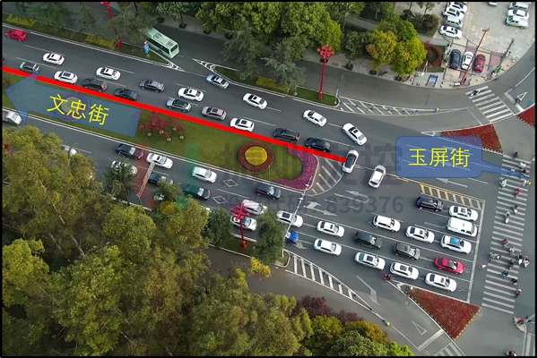 3.交叉口東、西、南、北向均存在占道施工情況,大大降低交叉口通行效率。其中,西進(jìn)口直行擁堵尤為嚴(yán)重,車輛排隊長度達(dá)700米,并回溢至下游文忠街-玉屏街交叉口。