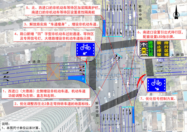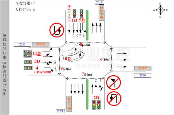 該交叉口前期已根據(jù)交通運(yùn)行情況進(jìn)行交通組織優(yōu)化,東西向大德路路段設(shè)置西往東單行,西進(jìn)口設(shè)有左轉(zhuǎn)待行區(qū),南進(jìn)口禁止左轉(zhuǎn)、掉頭,北進(jìn)口禁止掉頭。