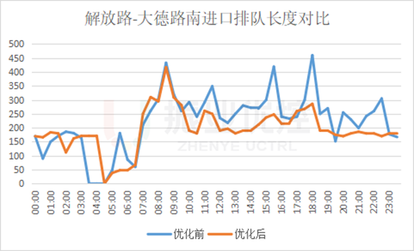 優(yōu)化后,南進(jìn)口排隊(duì)情況明顯好轉(zhuǎn),晚高峰南往北方向擁堵緩解,最大排隊(duì)長度由460米下降到286米,優(yōu)化率達(dá)37.8%;停車延誤由108.5秒下降到71.94秒,優(yōu)化率達(dá)33.7%。
