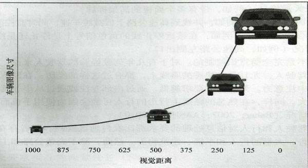 而基于視覺的生物特性,因?yàn)橐曈X距離和車輛圖像大小之間的關(guān)系并非線性關(guān)系,從而增加了道路使用者估算速度的難度,特別是當(dāng)車輛所占視角的變化速率小于0.2度/秒時,觀察者無法檢測到圖像大小在變化(如圖1)。