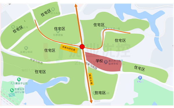 星光大道-肖家溝西支路位于重慶市兩江新區(qū)照母山片區(qū),北接金州大道,南連照母山隧道至照母山立交、新南路上跨橋等重要交通節(jié)點(diǎn)路口。路口東南角緊臨星湖學(xué)校,周邊多為大型住宅區(qū);北側(cè)星光大道南往北單行。