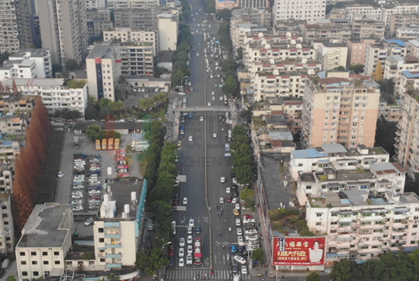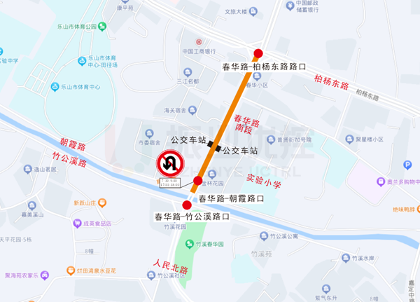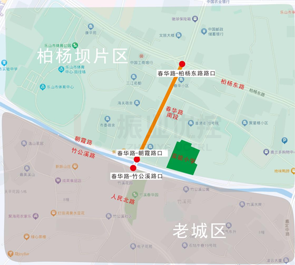 春華路是連接柏楊壩片區(qū)與老城區(qū)的重要道路,高峰期南段過境通勤交通流壓力較大。樂山市實驗小學位于柏楊壩片區(qū)春華路南段東側(cè),路段上下學接送需求大,過境通勤與接送車流重疊導致路段高峰期擁堵較為嚴重。