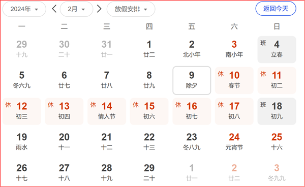 根據國務院辦公廳通知精神,2024年春節放假時間為2024年2月10日(星期六,初一)至2月17日(星期六,初八)放假調休,共8天。2月4日(星期日)、2月18日(星期日)上班。